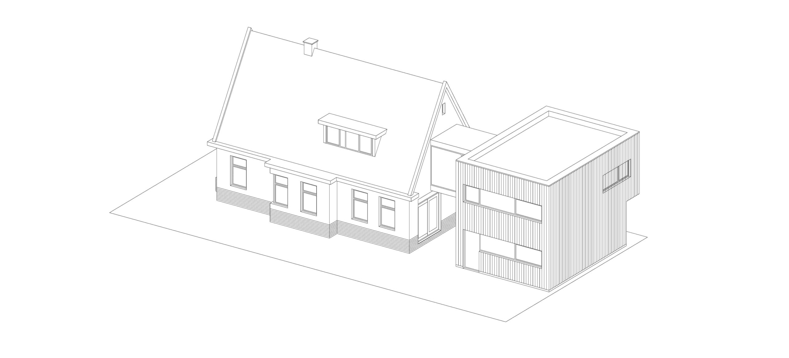 Istniejący dom do rozbudowy jest bardzo charakterystyczny dla regionu – niewielki, o zwartej tradycyjnej bryle, z dachem dwuspadowym o dużym kącie nachylenia oraz ceglaną elewacją z białymi detalami i stolarką. Obiekt znajduje się na typowej holenderskiej działce o powierzchni zaledwie 320 m2. Na szczęście lokalne przepisy są zdecydowanie mniej restrykcyjne od polskich w kwestii lokowania budynków względem granicy działki. Koncepcja rozbudowy zakładała umieszczenie dodatkowego budynku połączonego z budynkiem istniejącym w poziomie poddasza przeszklonym łącznikiem. Nowa bryła jest minimalistyczna i współczesna. Nie zależało mi na nawiązaniu, ale na stworzeniu dosyć neutralnego tła dla głównego budynku i ogrodu.