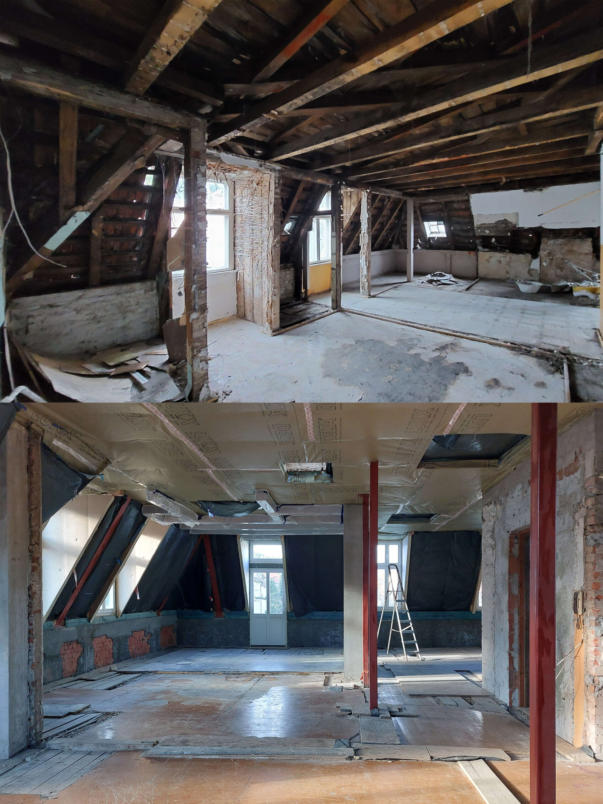 Budynek podlega ochronie, dlatego wszystkie zmiany musiały być konsultowane i uzgodnione z Wojewódzkim Konserwatorem Zabytków. To, co wydawało się wcześniej niemożliwe, udało się uzgodnić i zrealizować: rozebrać dwa nieużywane kominy stłoczone wokół jednej z lukarn, dodać dwie lukarny od tyłu budynku (jedna z dodatkowym wyjściem na dach werandy) z widokiem na dachy okolicznej zabudowy i zieleń, zainstalować sześć świetlików do dachu płaskiego (przy czym jeden na klatce schodowej pełni jednocześnie rolę klapy oddymiającej, co było wymogiem uzgodnień ppoż.), dodać dwa okna połaciowe od północy oraz zmienić konstrukcję dachu na stalowo-drewnianą (aby do minimum ograniczyć ilość podpór dachu).