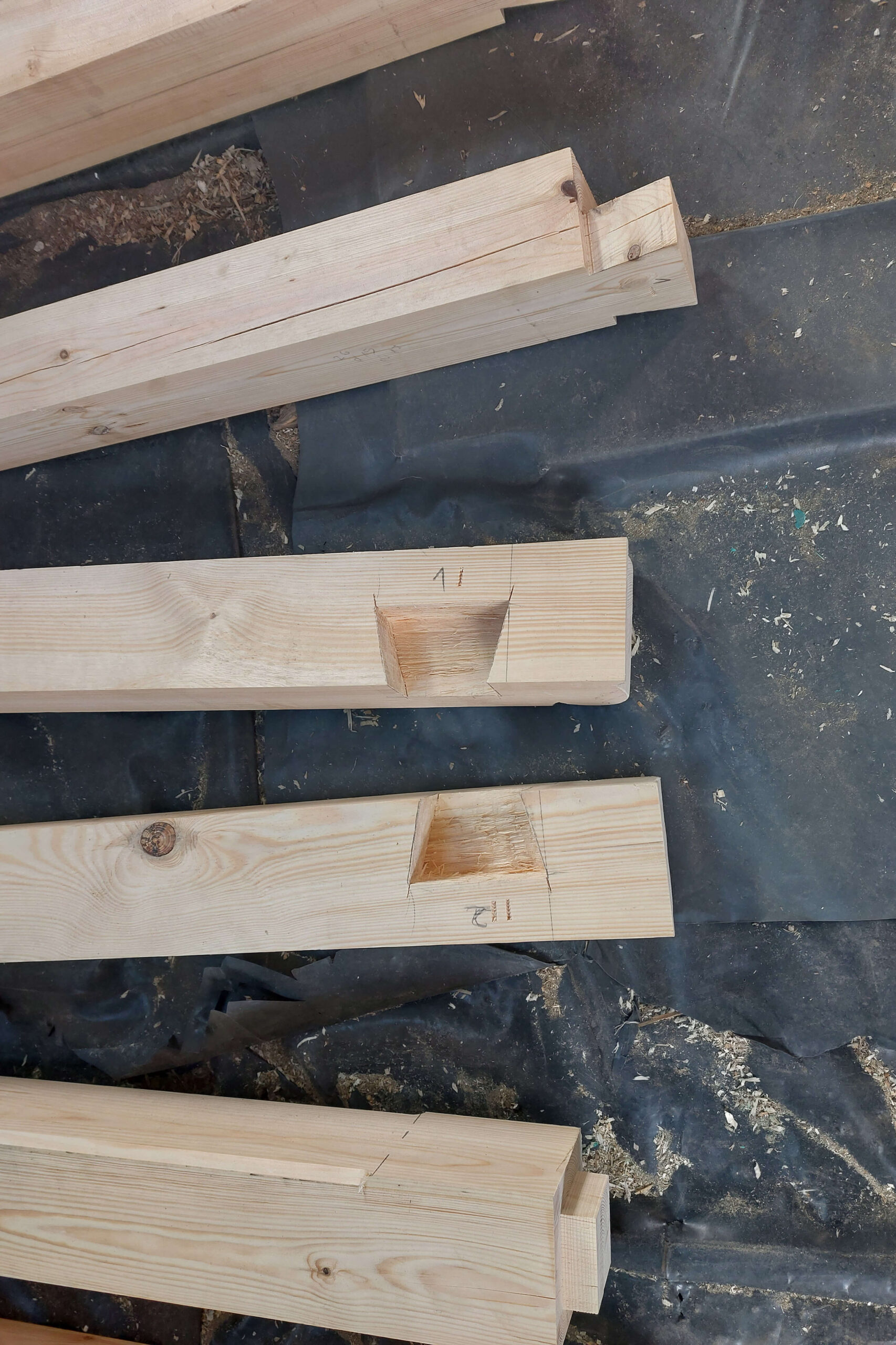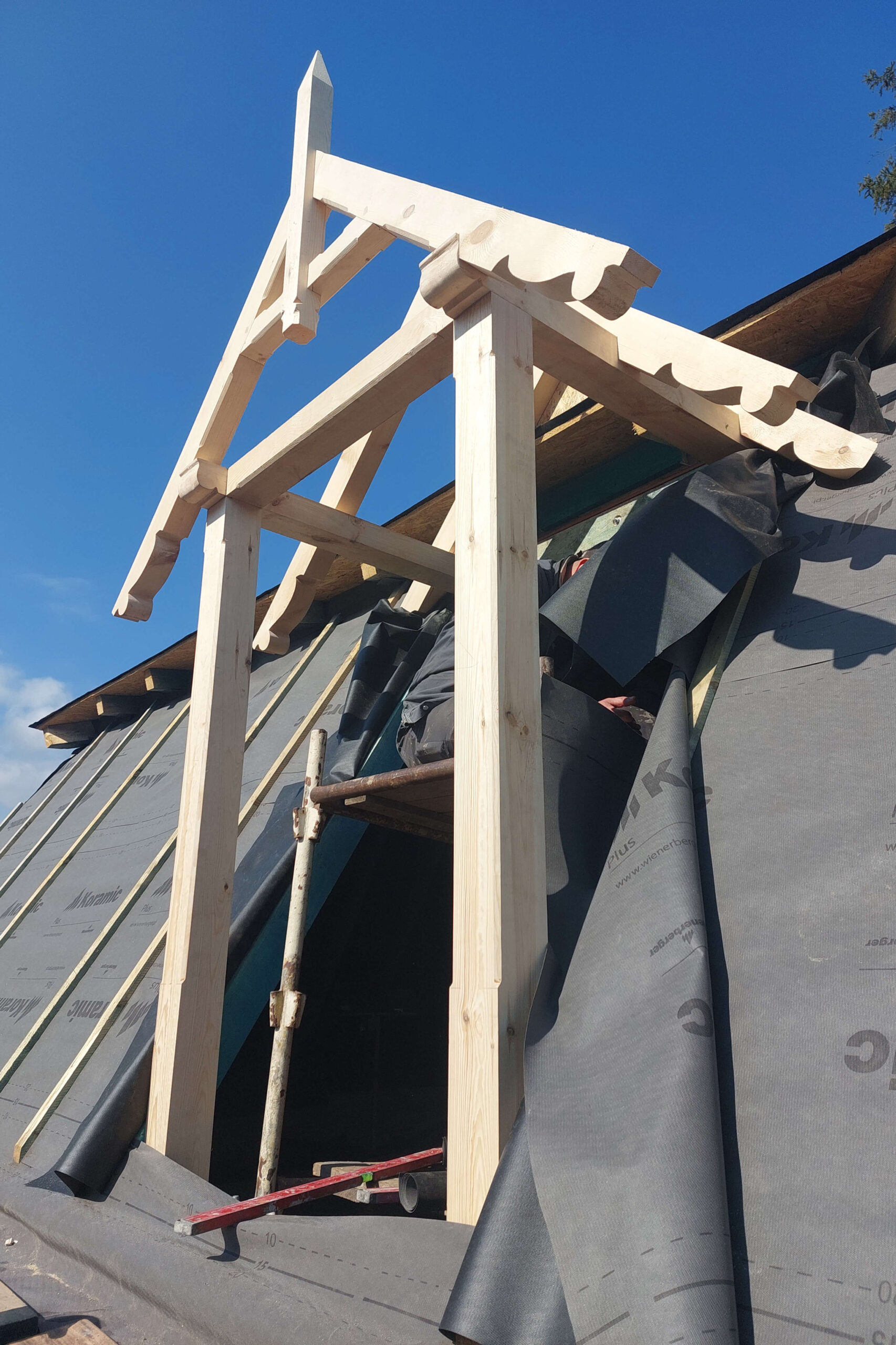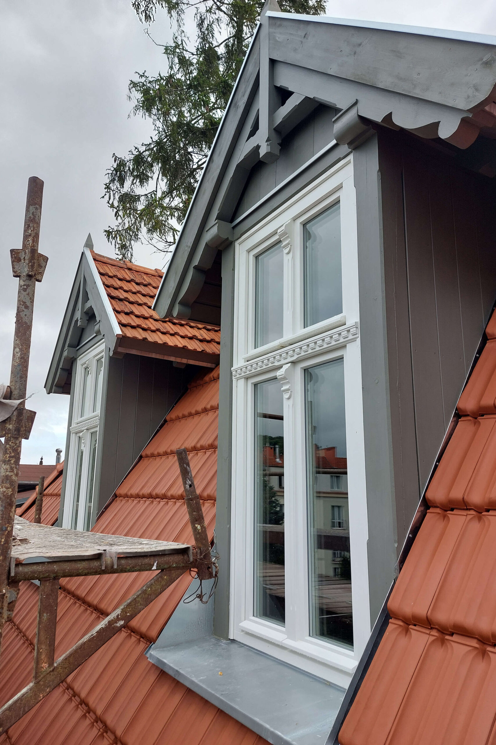 Niestety, część założeń projektowych zweryfikował już pierwszy etap budowy. Większość drewna okazała się niezdatna do wtórnego wbudowania, dlatego wraz z Wykonawcą dochowaliśmy wszelkiej staranności by elementy oryginalne odtworzyć – m.in. drewniane lukarny wraz połączeniami ciesielskimi. W trakcie prac okazało się również, że nie do odratowania jest stolarka okienna. Tu zastosowany został kompromis – Konserwator zgodził się na zmianę konstrukcji skrzynkowej okien na jednoramową, na czym, ze względów praktycznych, bardzo zależało Inwestorowi. Zewnętrzny dekor okien został odtworzony prawie 1:1 na podstawie dokładnie przez nas przygotowanych rysunków starych okien (tu nieoceniona okazała się jak zwykle Agnieszka Sokoll) i zdemontowanych fragmentów, które stolarz wziął na warsztat na wzór.