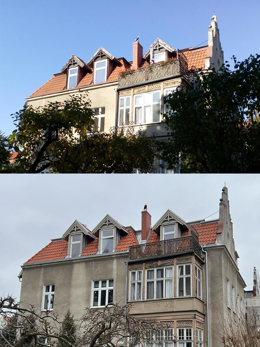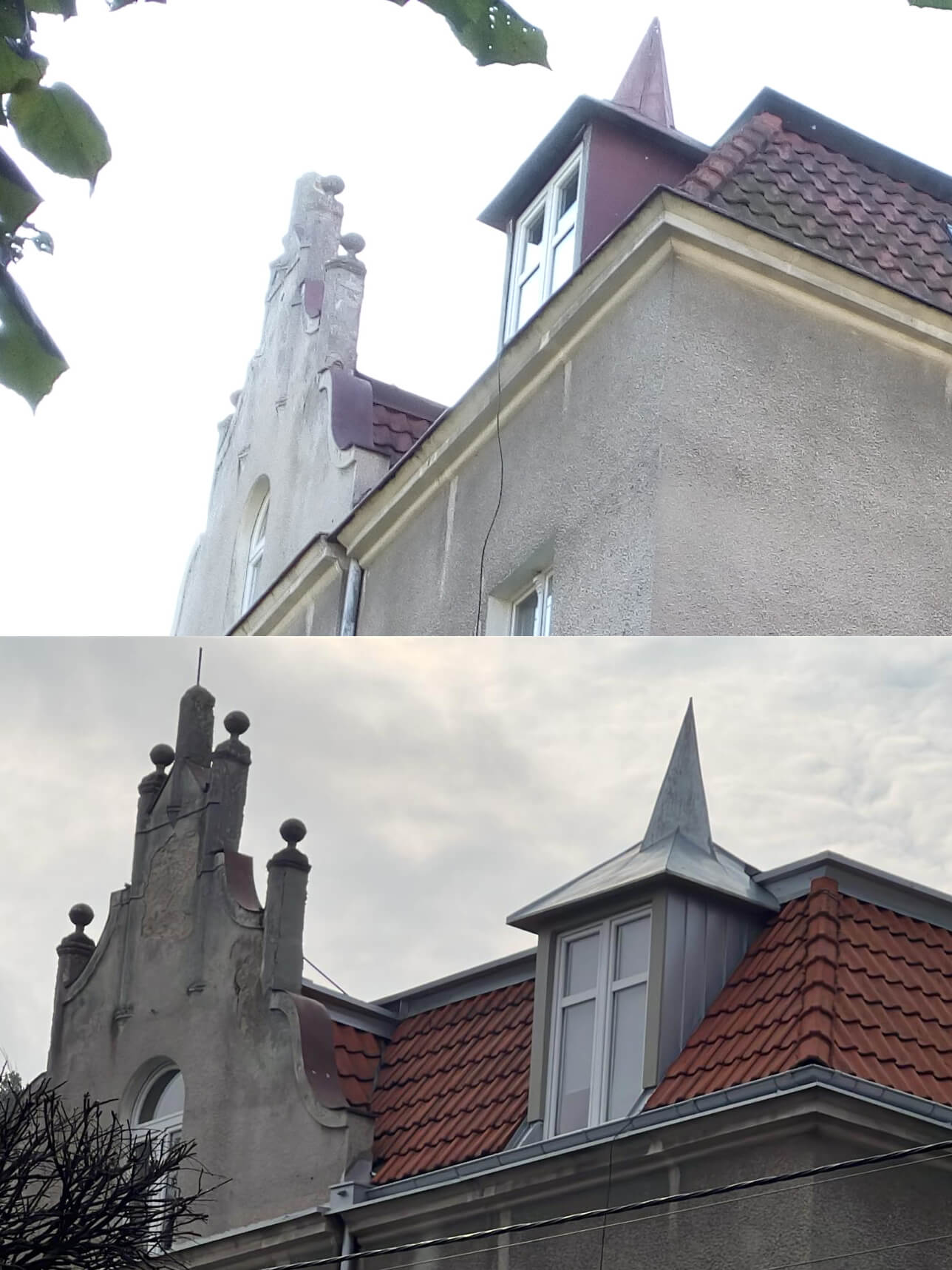 Na ostatnich fotografiach widać porównanie przed i po remoncie lukarn dachowych.