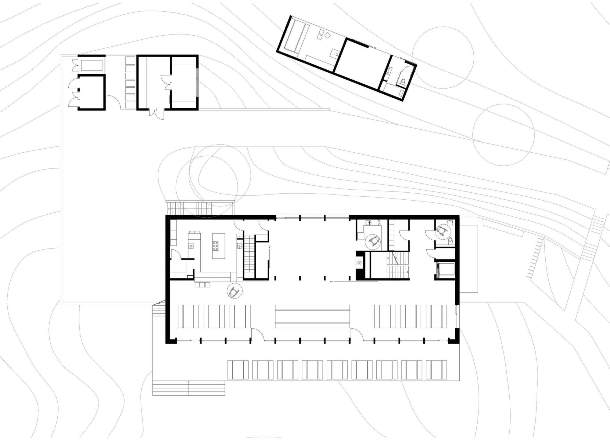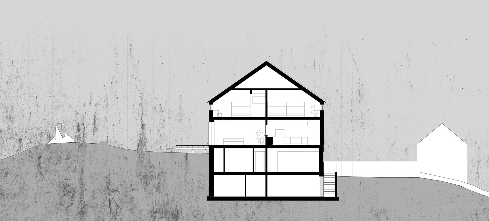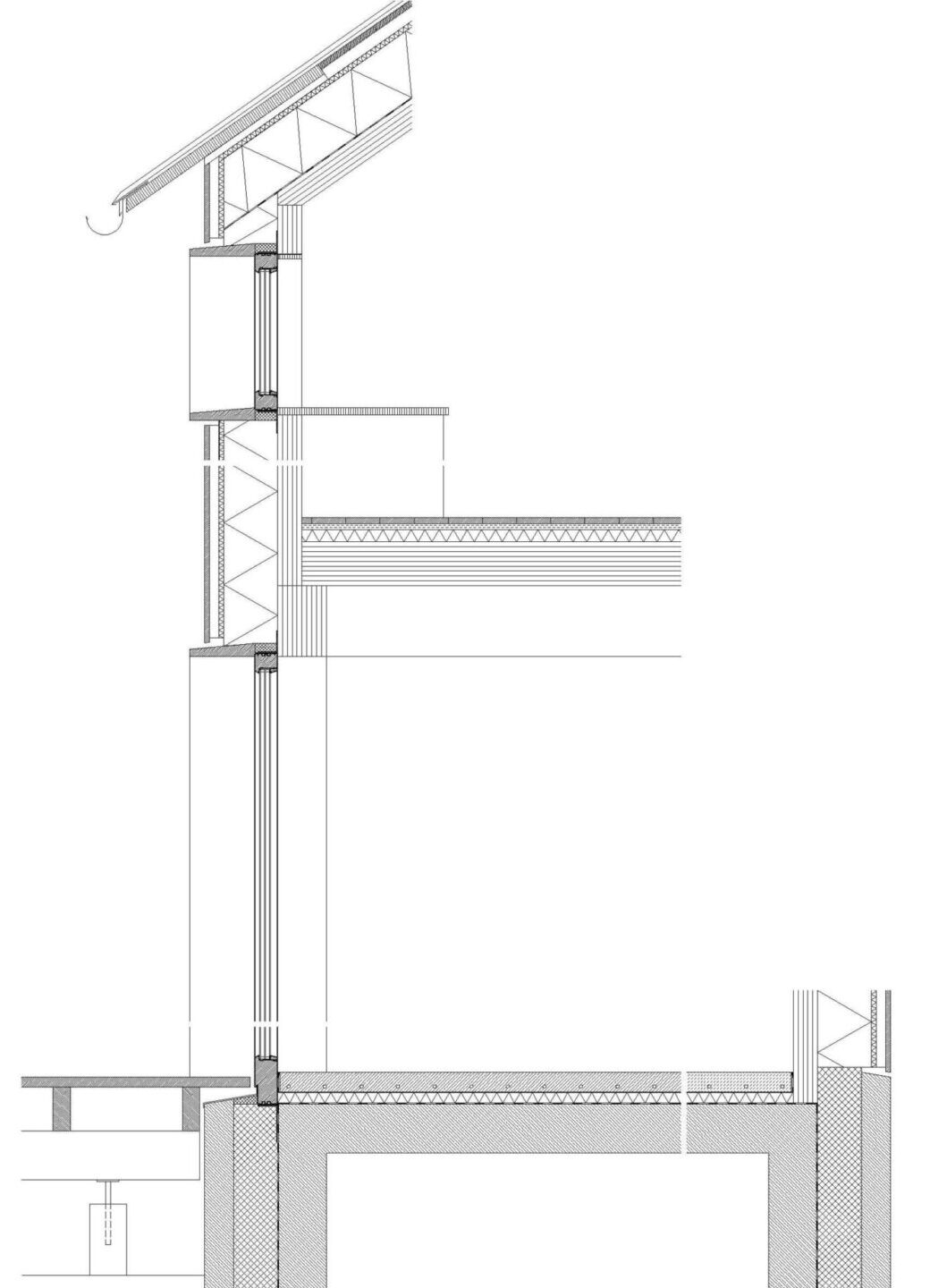 Idea „budynku modelowego” znajduje odzwierciedlenie w skromnej formie, prostej konstrukcji i oszczędnym, ustandaryzowanym wystroju wnętrz. Betonowe przyziemie z warstwą wykończeniową z betonu wylewanego na miejscu (cast-in-situ) zostało zwieńczone konstrukcją z drewna klejonego warstwowo, obłożoną poziomymi deskami świerkowymi w kolorze ciemnoszarym. Surowy beton, drewno i kamień (odzyskany ze starego budynku i wykorzystany w murach oporowych) to główne materiały projektowe. Projekt miał na celu wyeksponowanie elementów konstrukcyjnych oraz tekstur materiałów, rezygnując z warstw wykończeniowych wszędzie tam, gdzie było to możliwe.