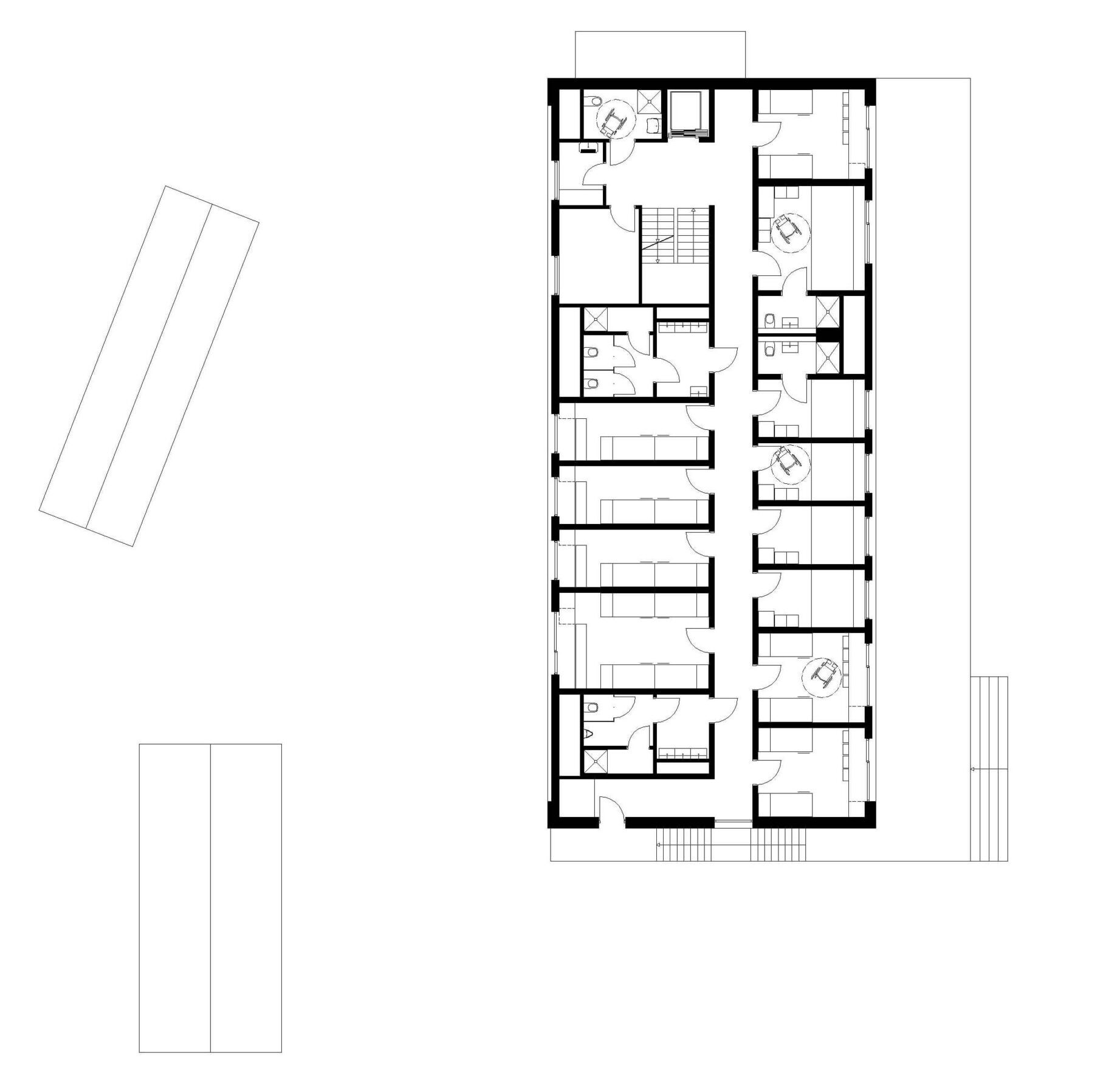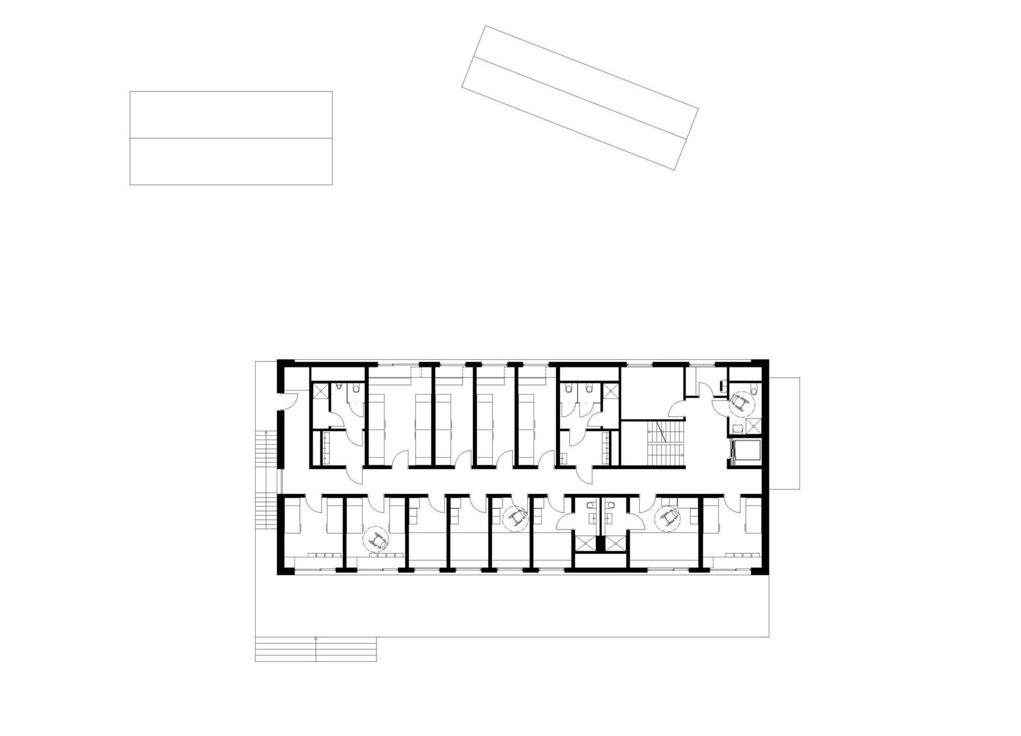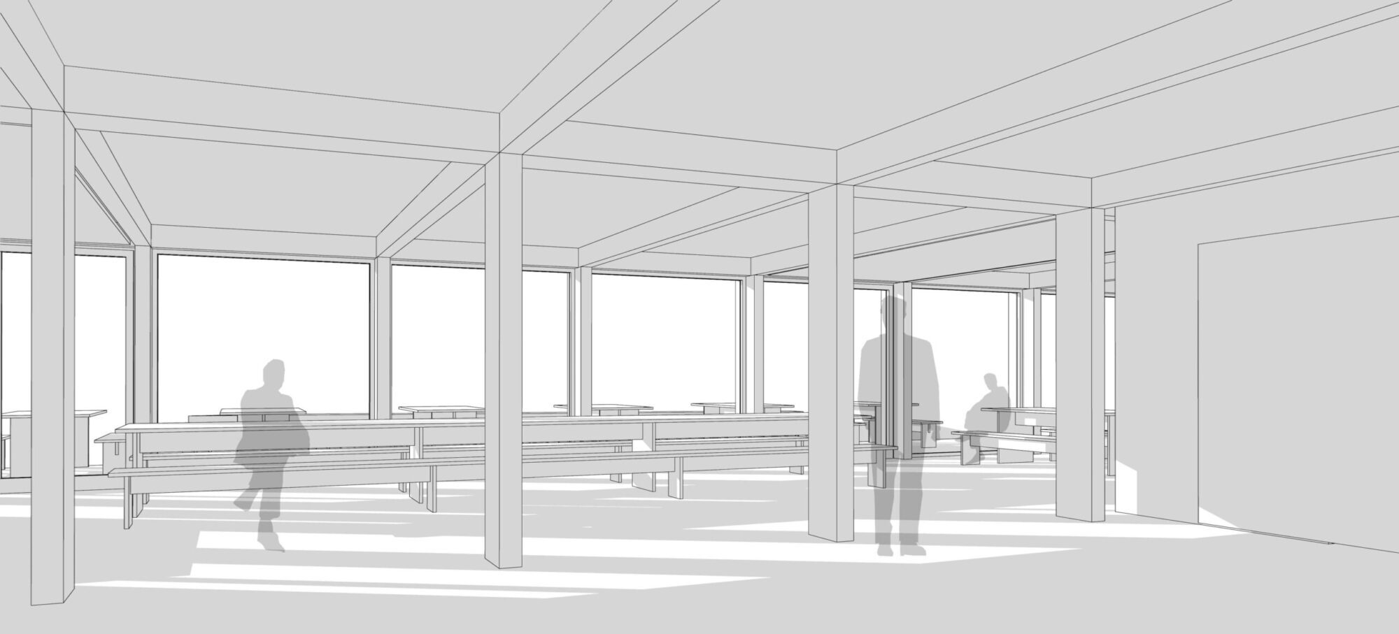 Idea „budynku modelowego” znajduje odzwierciedlenie w skromnej formie, prostej konstrukcji i oszczędnym, ustandaryzowanym wystroju wnętrz. Betonowe przyziemie z warstwą wykończeniową z betonu wylewanego na miejscu (cast-in-situ) zostało zwieńczone konstrukcją z drewna klejonego warstwowo, obłożoną poziomymi deskami świerkowymi w kolorze ciemnoszarym. Surowy beton, drewno i kamień (odzyskany ze starego budynku i wykorzystany w murach oporowych) to główne materiały projektowe. Projekt miał na celu wyeksponowanie elementów konstrukcyjnych oraz tekstur materiałów, rezygnując z warstw wykończeniowych wszędzie tam, gdzie było to możliwe.