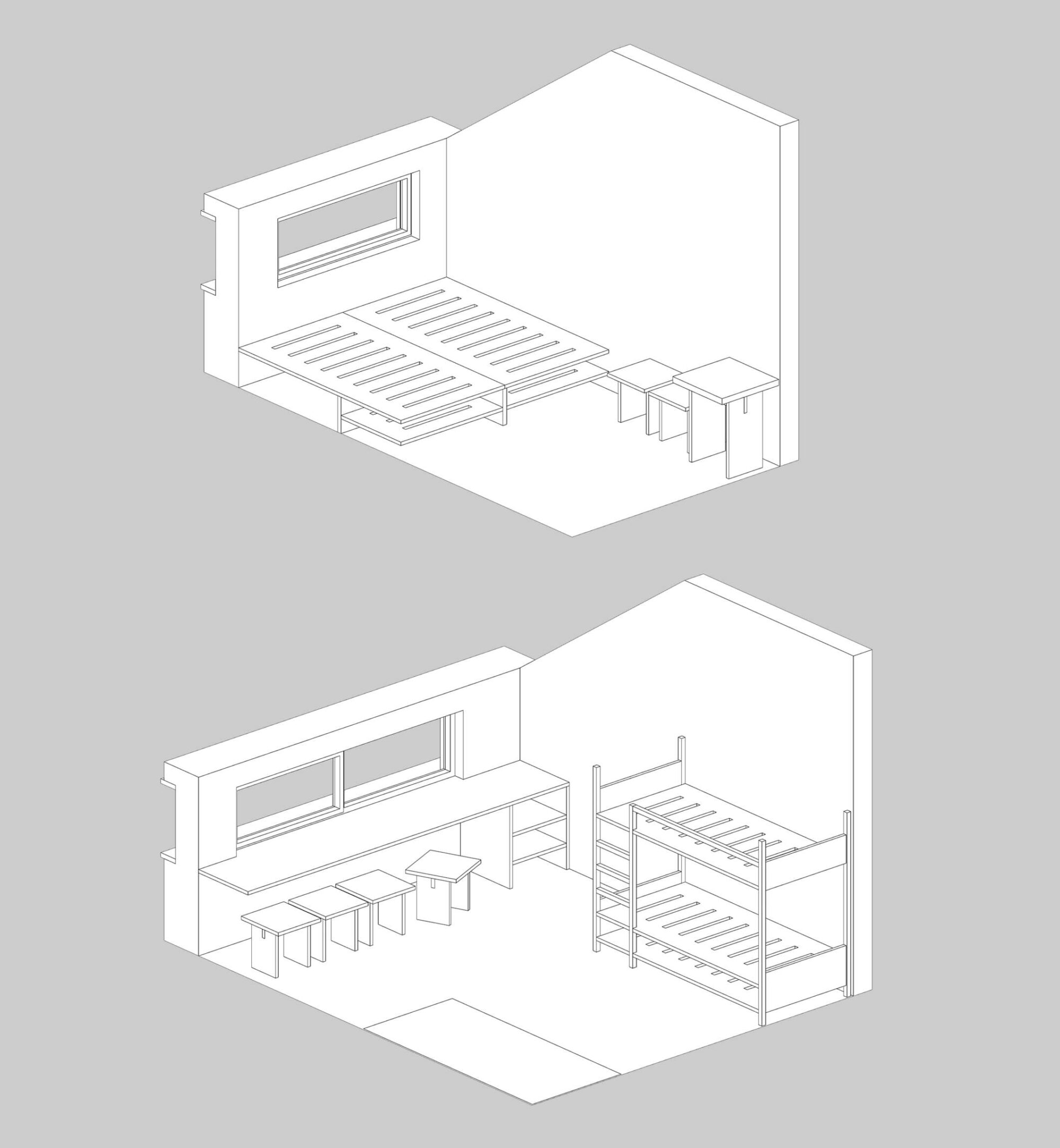 Schronisko zostało celowo zaprojektowane jako azyl/schronienie, nie hotel. Składa się z dwunastu ujednoliconych pokoi gościnnych z minimalistycznymi, projektowanymi na zamówienie drewnianymi meblami. Sercem budynku jest jadalnia usytuowana na parterze, podzielona przesuwnymi drzwiami na dwie części: salę główną z tarasem i widokiem na dolinę oraz mniejszą przestrzeń wielofunkcyjną z widokiem na drzewa i polanę, na której stoi wieża widokowa na Lubaniu.