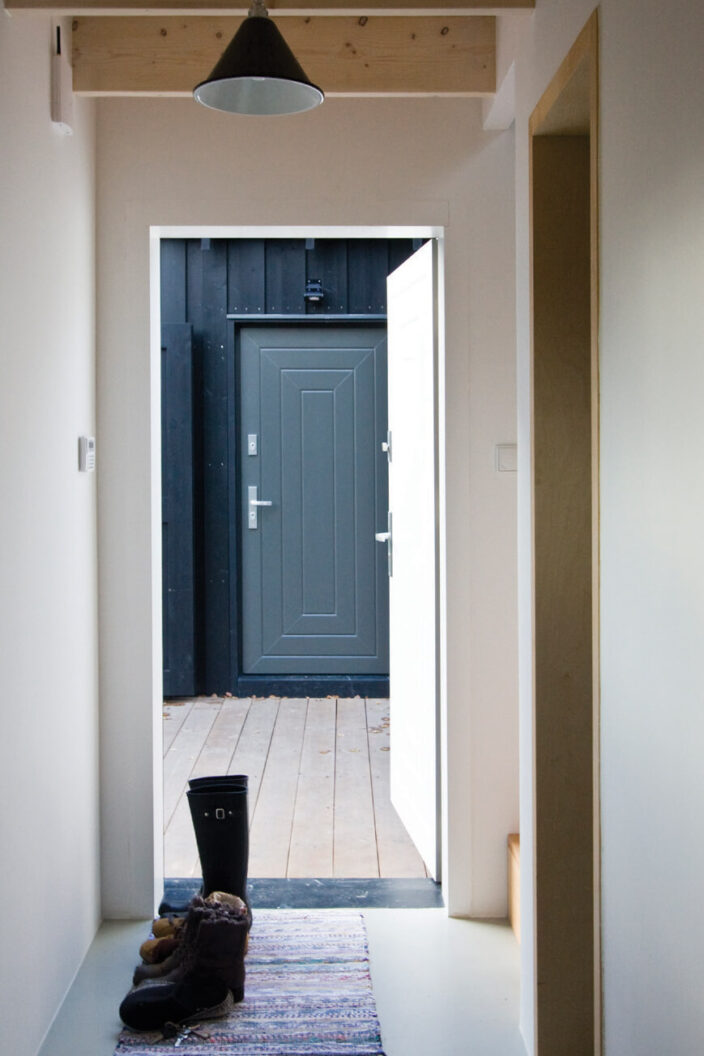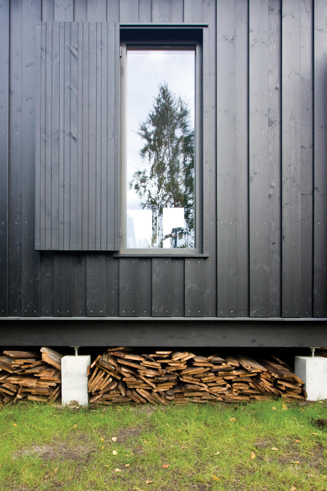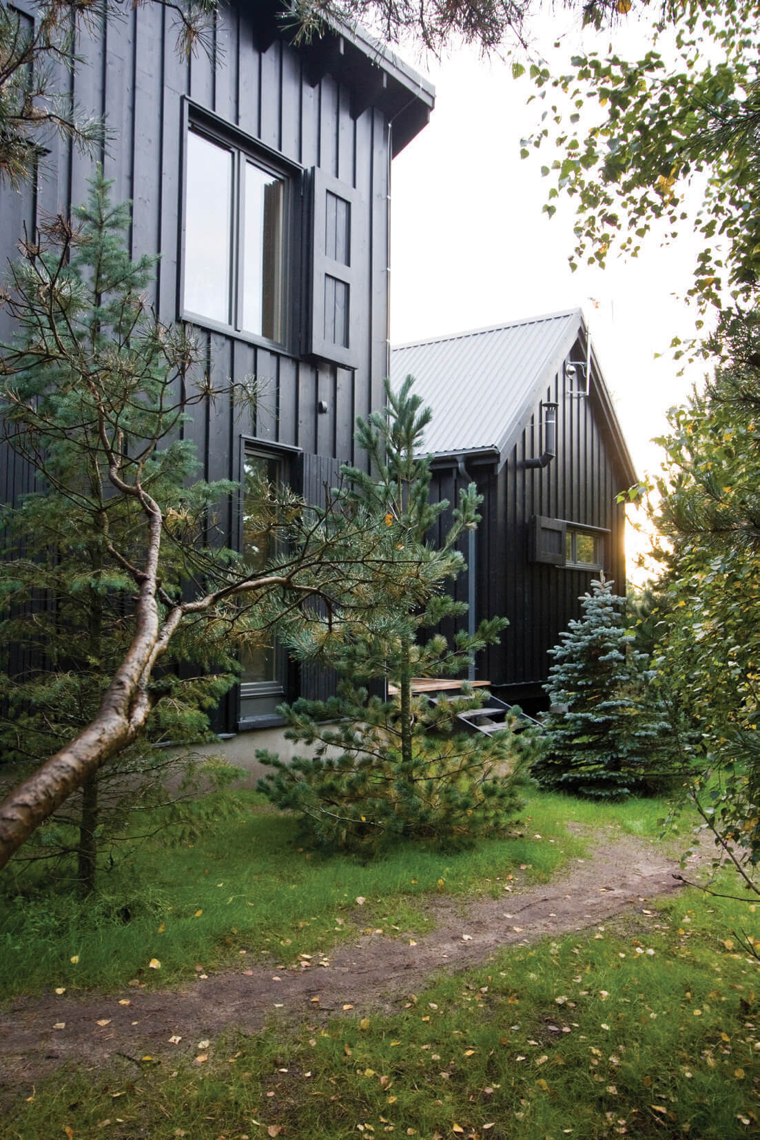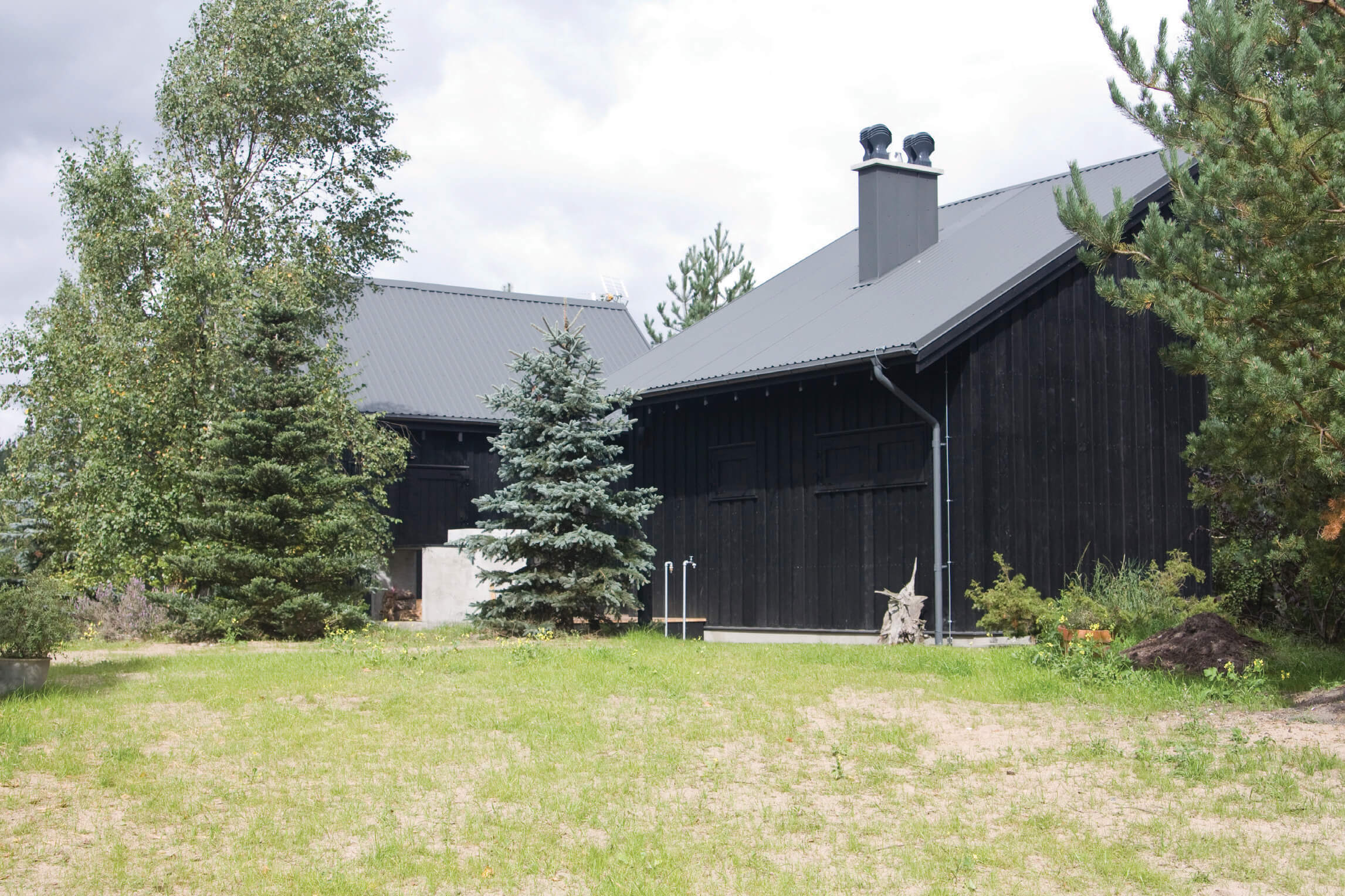 Zabudowa składa się z dwóch oddzielnych budynków połączonych drewnianym tarasem z miejscem na grill. Formy budynków są skromne — priorytetem architektonicznym było wtopienie zabudowy w zieleń. To także jeden z powodów wyboru czarnego koloru elewacji. Rodzaj okładziny i kolor nawiązują do lokalnego budownictwa tradycyjnego. Regionalny styl widać także w podstawowych proporcjach budynków w widoku od strony drogi i w detalu drzwi wejściowych. Współczesnymi elementami są duże przeszklenia i minimalistyczne detale. Jeden z budynków posiada dach jednospadowy i od tyłu wysoką ścianę z dwoma rzędami okien. Okna na poddaszu otwierają się na zniewalające widoki ponad koronami drzew na działce.