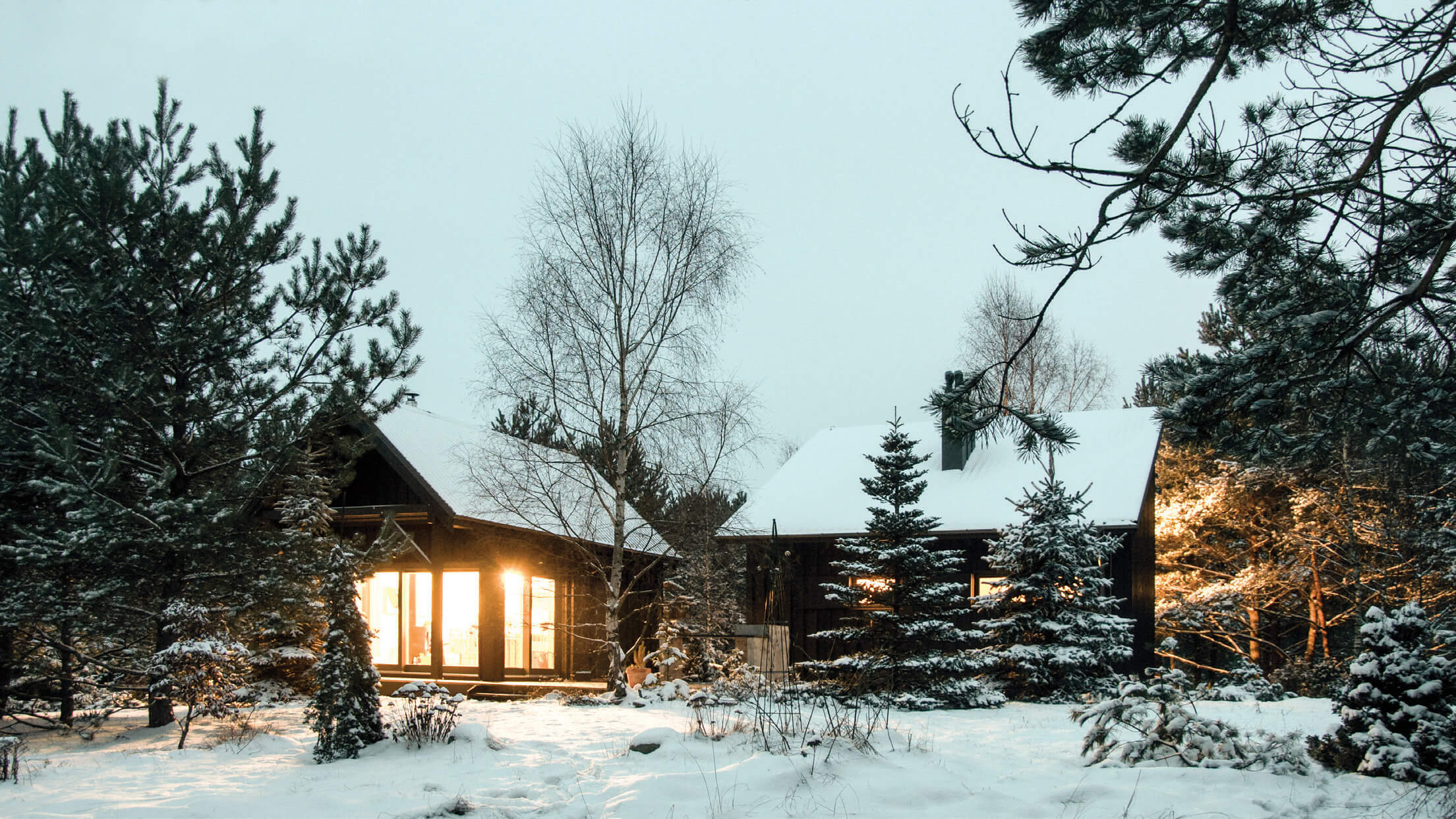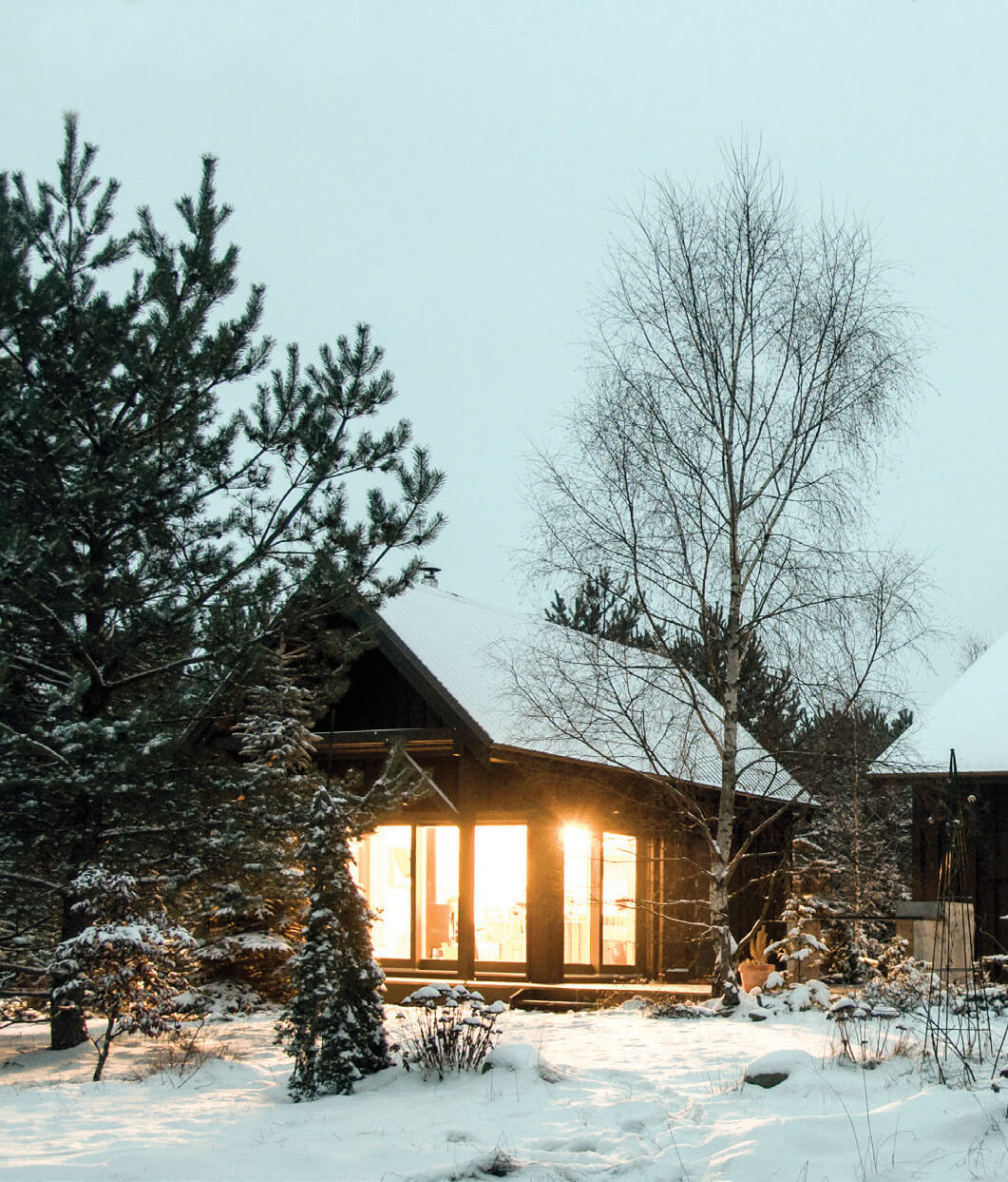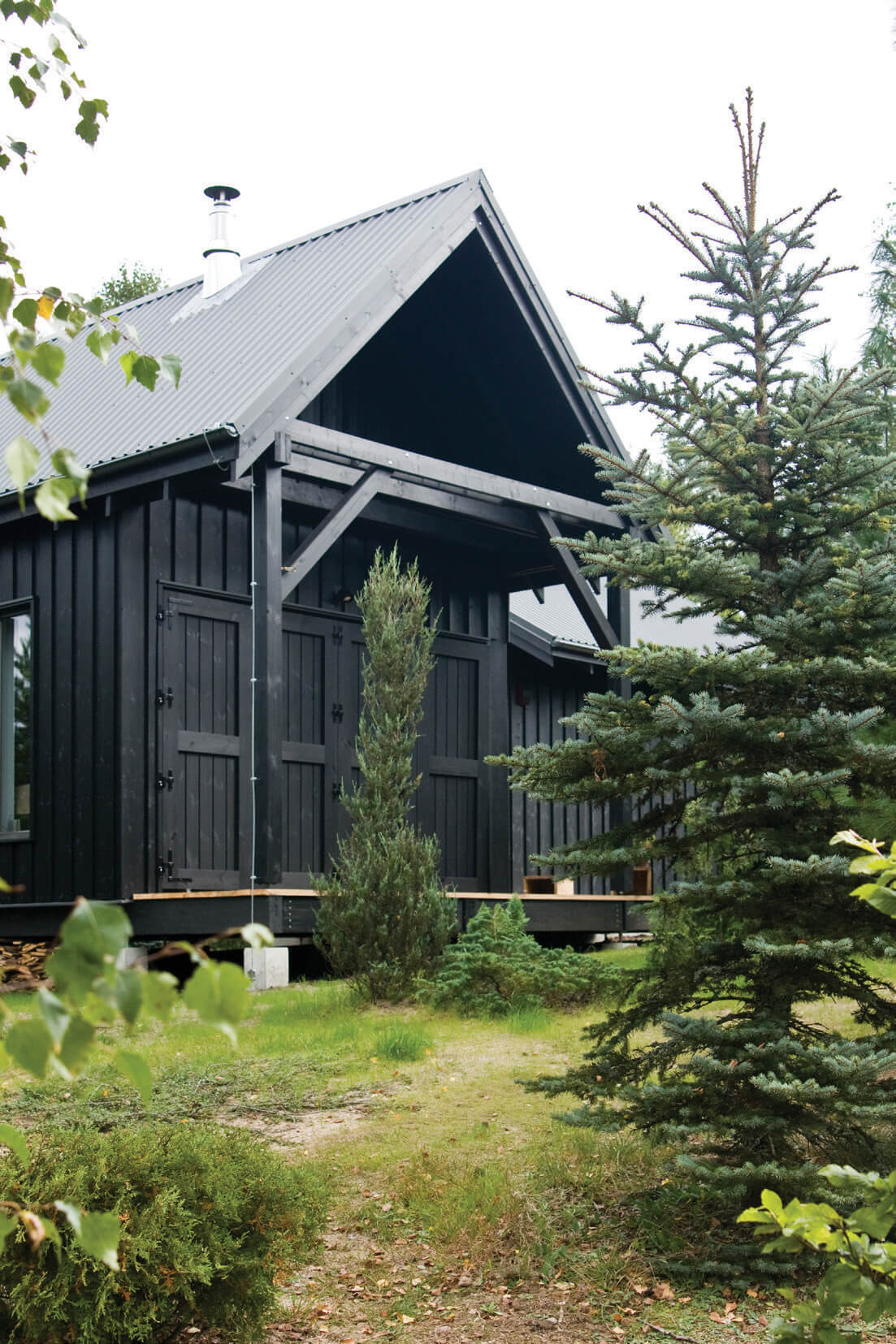 Zabudowa składa się z dwóch oddzielnych budynków połączonych drewnianym tarasem z miejscem na grill. Formy budynków są skromne — priorytetem architektonicznym było wtopienie zabudowy w zieleń. To także jeden z powodów wyboru czarnego koloru elewacji. Rodzaj okładziny i kolor nawiązują do lokalnego budownictwa tradycyjnego. Regionalny styl widać także w podstawowych proporcjach budynków w widoku od strony drogi i w detalu drzwi wejściowych. Współczesnymi elementami są duże przeszklenia i minimalistyczne detale. Jeden z budynków posiada dach jednospadowy i od tyłu wysoką ścianę z dwoma rzędami okien. Okna na poddaszu otwierają się na zniewalające widoki ponad koronami drzew na działce.