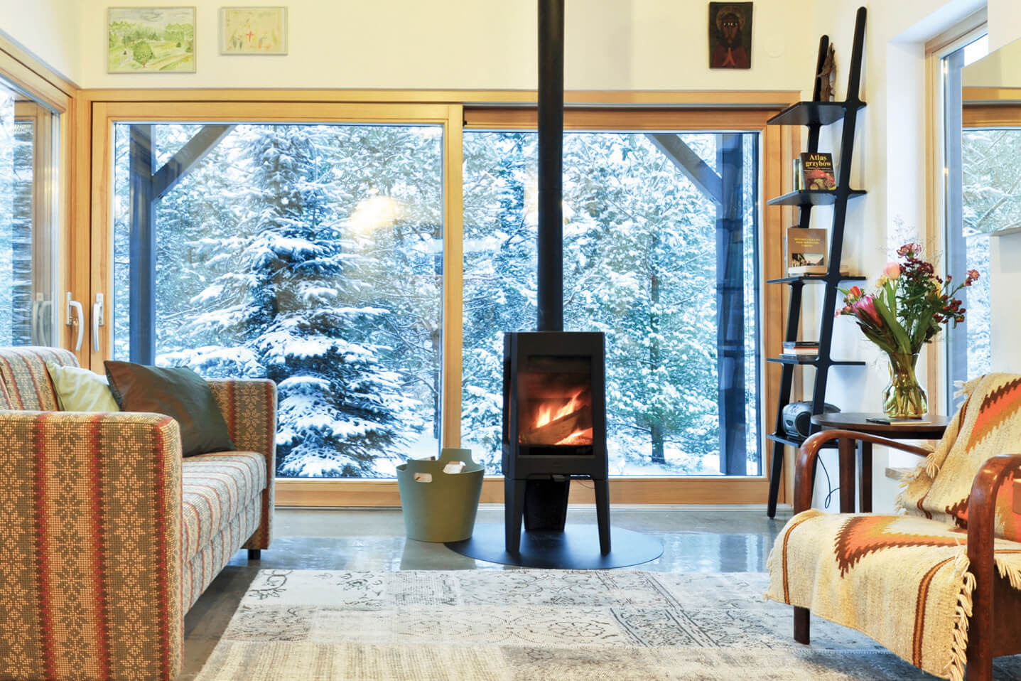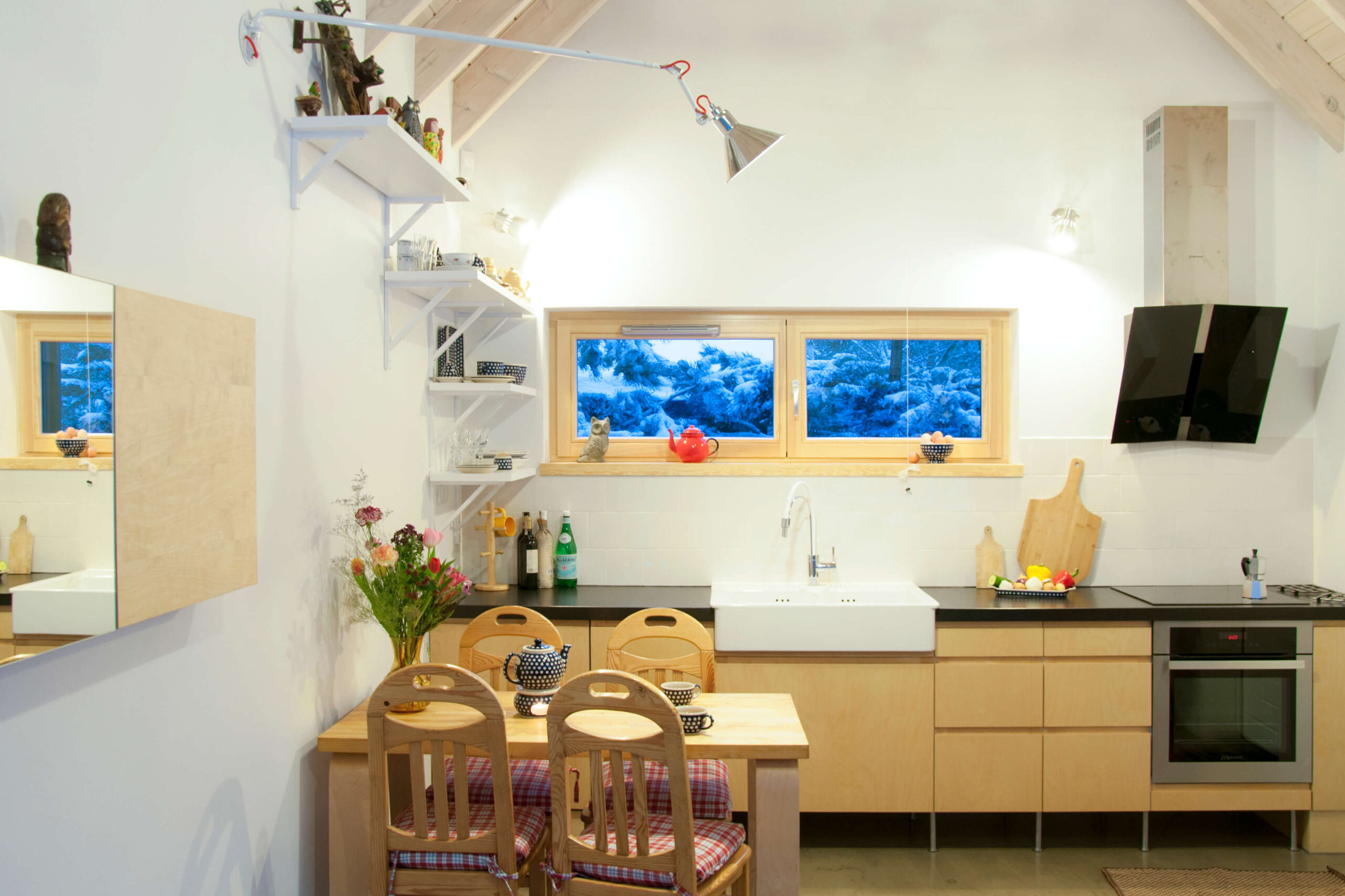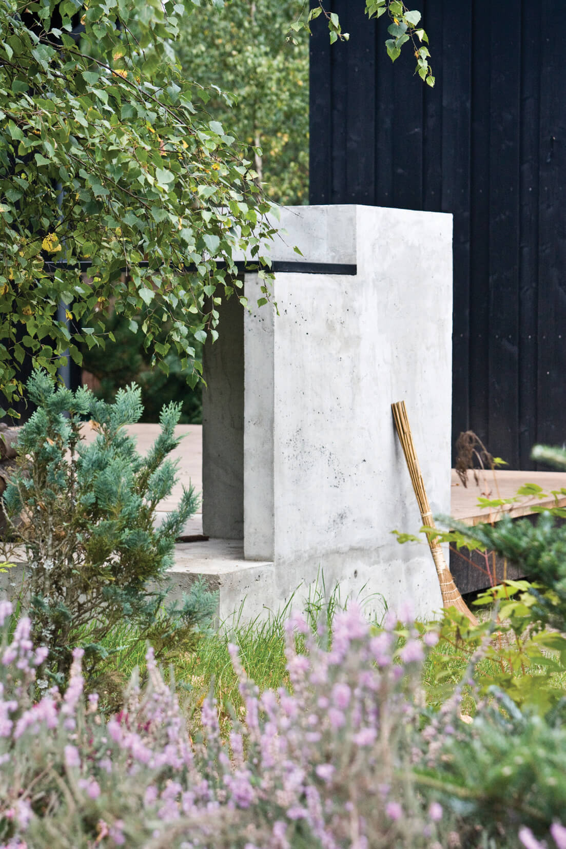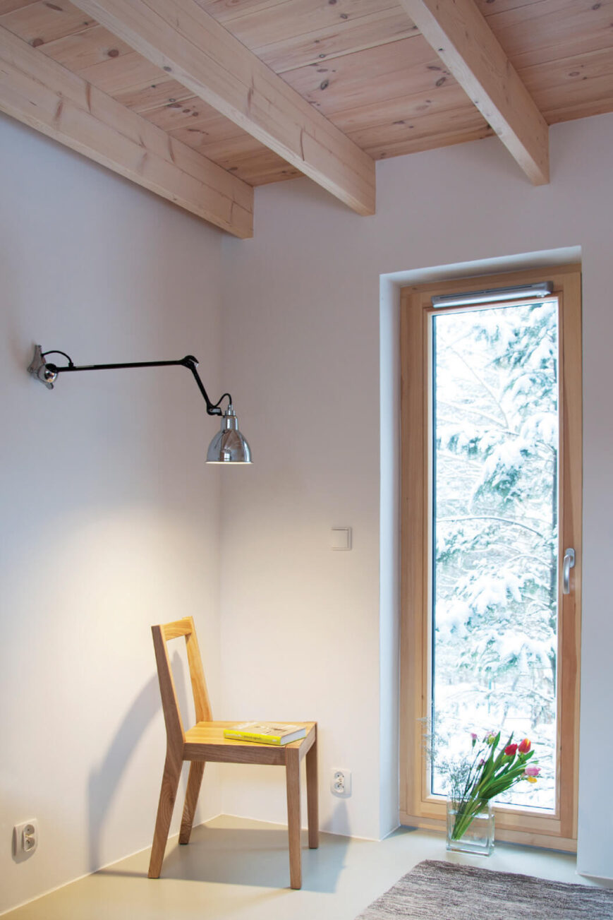 Zabudowa składa się z dwóch oddzielnych budynków połączonych drewnianym tarasem z miejscem na grill. Formy budynków są skromne — priorytetem architektonicznym było wtopienie zabudowy w zieleń. To także jeden z powodów wyboru czarnego koloru elewacji. Rodzaj okładziny i kolor nawiązują do lokalnego budownictwa tradycyjnego. Regionalny styl widać także w podstawowych proporcjach budynków w widoku od strony drogi i w detalu drzwi wejściowych. Współczesnymi elementami są duże przeszklenia i minimalistyczne detale. Jeden z budynków posiada dach jednospadowy i od tyłu wysoką ścianę z dwoma rzędami okien. Okna na poddaszu otwierają się na zniewalające widoki ponad koronami drzew na działce.