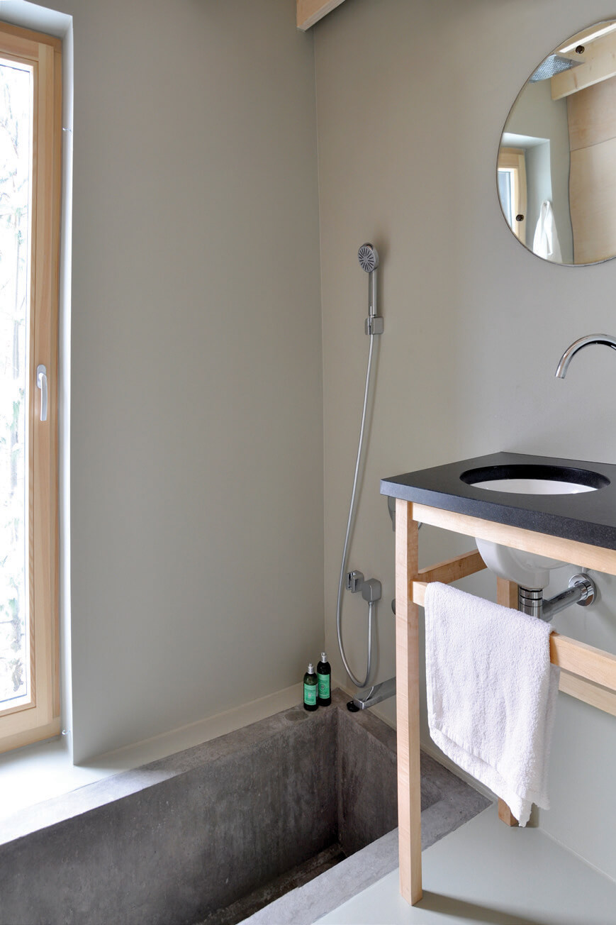 Budynek z dachem dwuspadowym to otwarta przestrzeń dzienna z aneksem kuchennym usytuowanym na ścianie północno-wschodniej. W drugim budynku znajdują się łazienka z betonową wanną wbudowaną w posadzkę i widokiem na prywatny las oraz dwie sypialnie: jednoosobowa na parterze i dwuosobowa na poddaszu. Ze względu na ograniczoną dopuszczalną powierzchnię zabudowy pod drugim budynkiem i częścią tarasu umieszczono piwnicę, gdzie znajdują się większość urządzeń technicznych oraz przestrzeń gospodarcza.