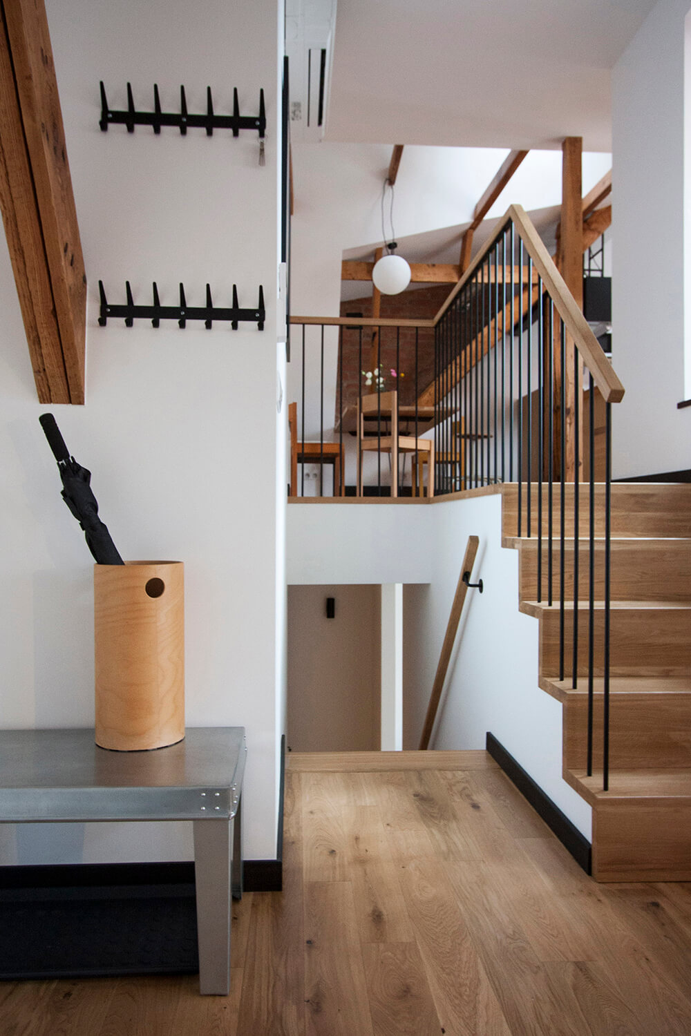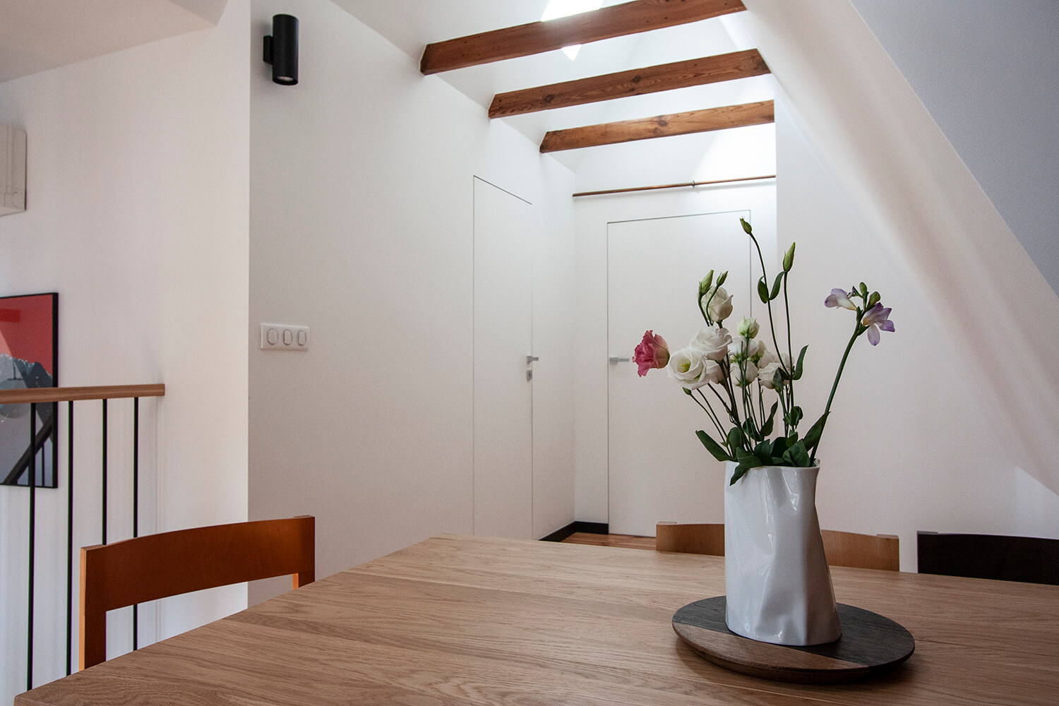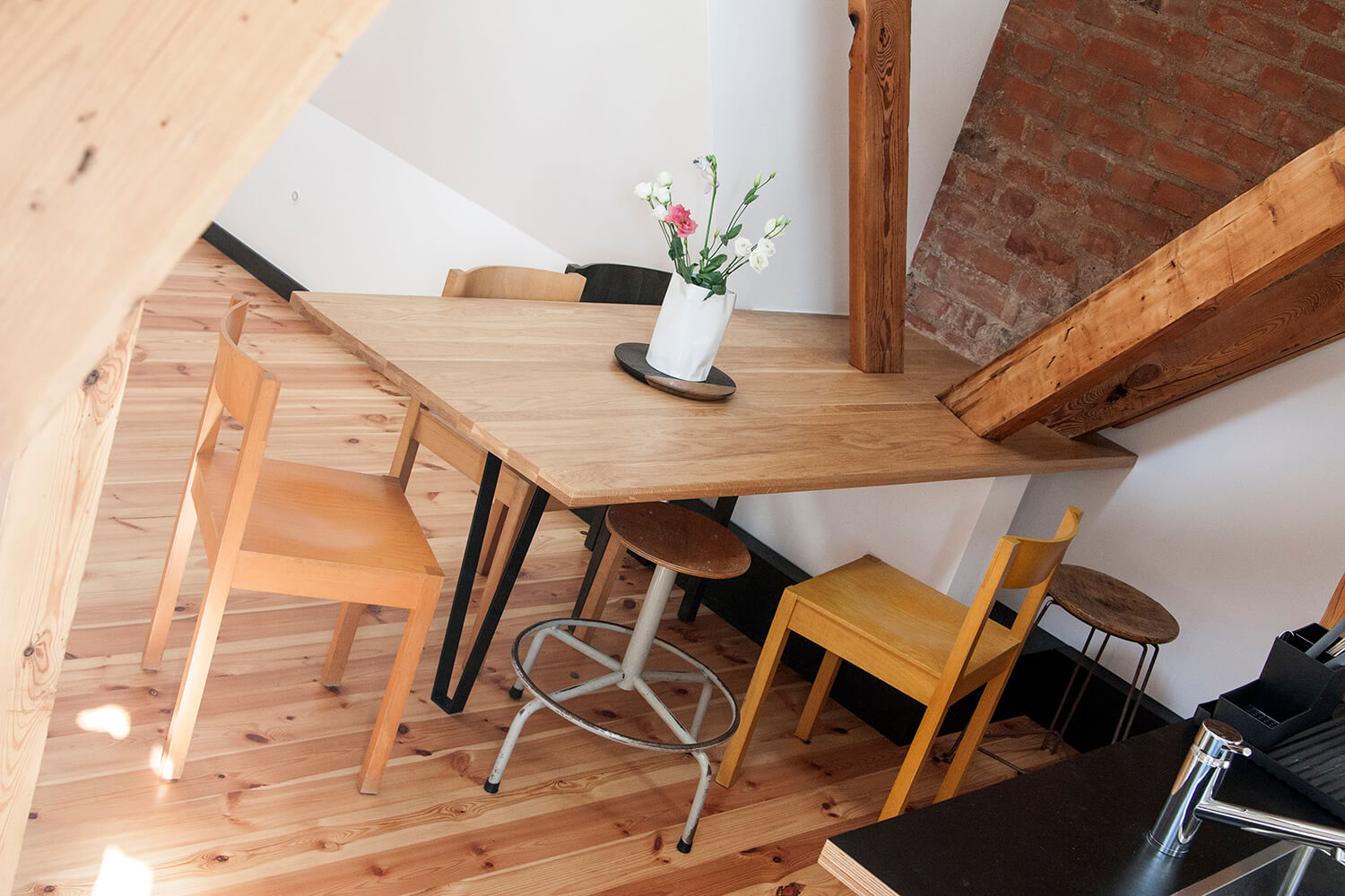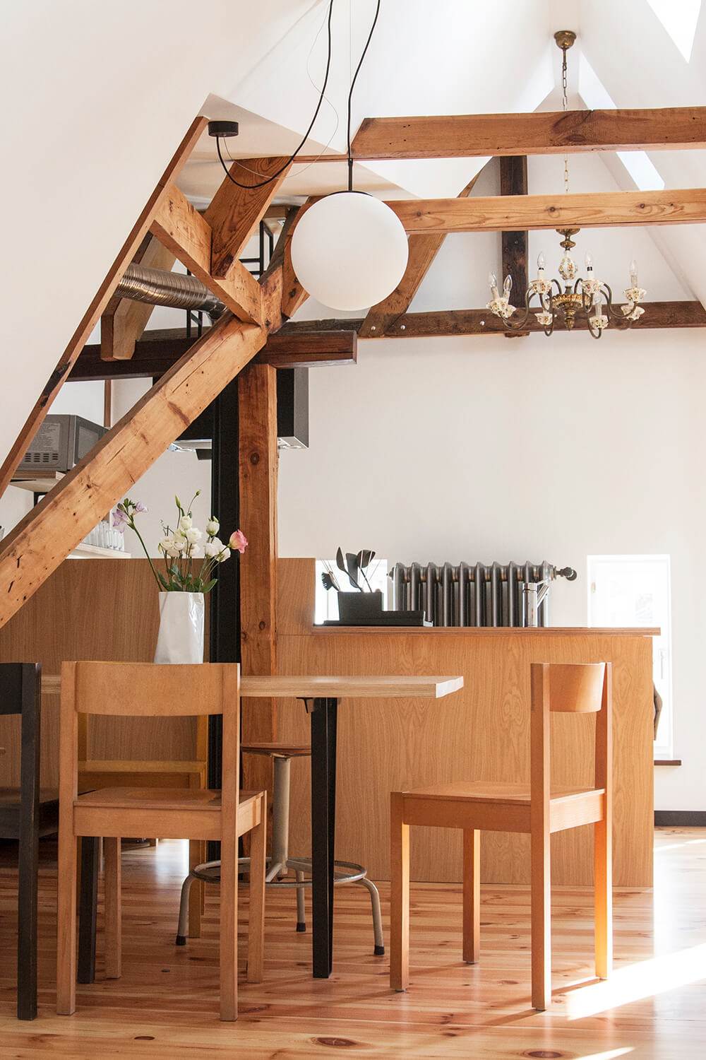 Jednym z głównych założeń projektowych było wyeksponowanie istniejących elementów konstrukcji drewnianej. Belki zostały oczyszczone i zaolejowane, a oryginalne sosnowe deski podłogowe zdemontowano, poddano renowacji w lokalnym warsztacie i ponownie wykorzystano na najwyższym poziomie apartamentu obejmującym kuchnię, jadalnię oraz sypialnię. Częściowo ze względu na obecność tych rustykalnych elementów drewnianych zdecydowano się zachować eklektyczny, nieco rustykalny charakter wnętrza. Minimalistyczne, wykonywane na zamówienie meble do zabudowy zestawiono z meblami i obiektami dekoracyjnymi vintage. W mieszkaniu wykorzystano m.in.: będące w posiadaniu właścicieli klasyczne polskie krzesła Śnieżnik 300-201 wyprodukowane w latach 70-tych przez Zjednoczenie Przemysłu Meblarskiego Bystrzyckie Fabryki Mebli; krzesła z serii No Sign of Design projektu holenderskiego designera Richarda Huttena; wazon i półmisek z holenderskiej manufaktury Zaaalberg; obracany stołek kreślarski z pracowni architektonicznej ojca mojego ówczesnego partnera Klaasa, wazon Pogięty zaprojektowany przez Marka Cecułę produkowany pod marką Ćmielów Design Studio. Nowe życie uzyskało również kilka elementów starego wyposażenia – cudaczny żyrandol kuchenny, żeliwny grzejnik, który przeszedł specjalistyczną renowację i deski z rozbiórki starych schodów, z których wykonano stoliki nocne.