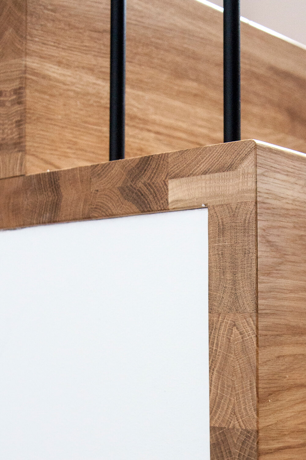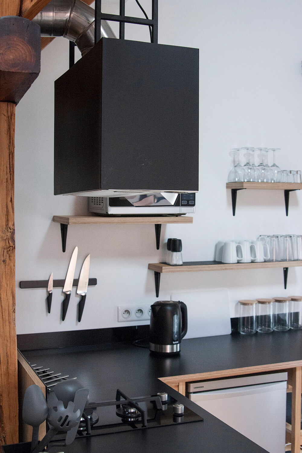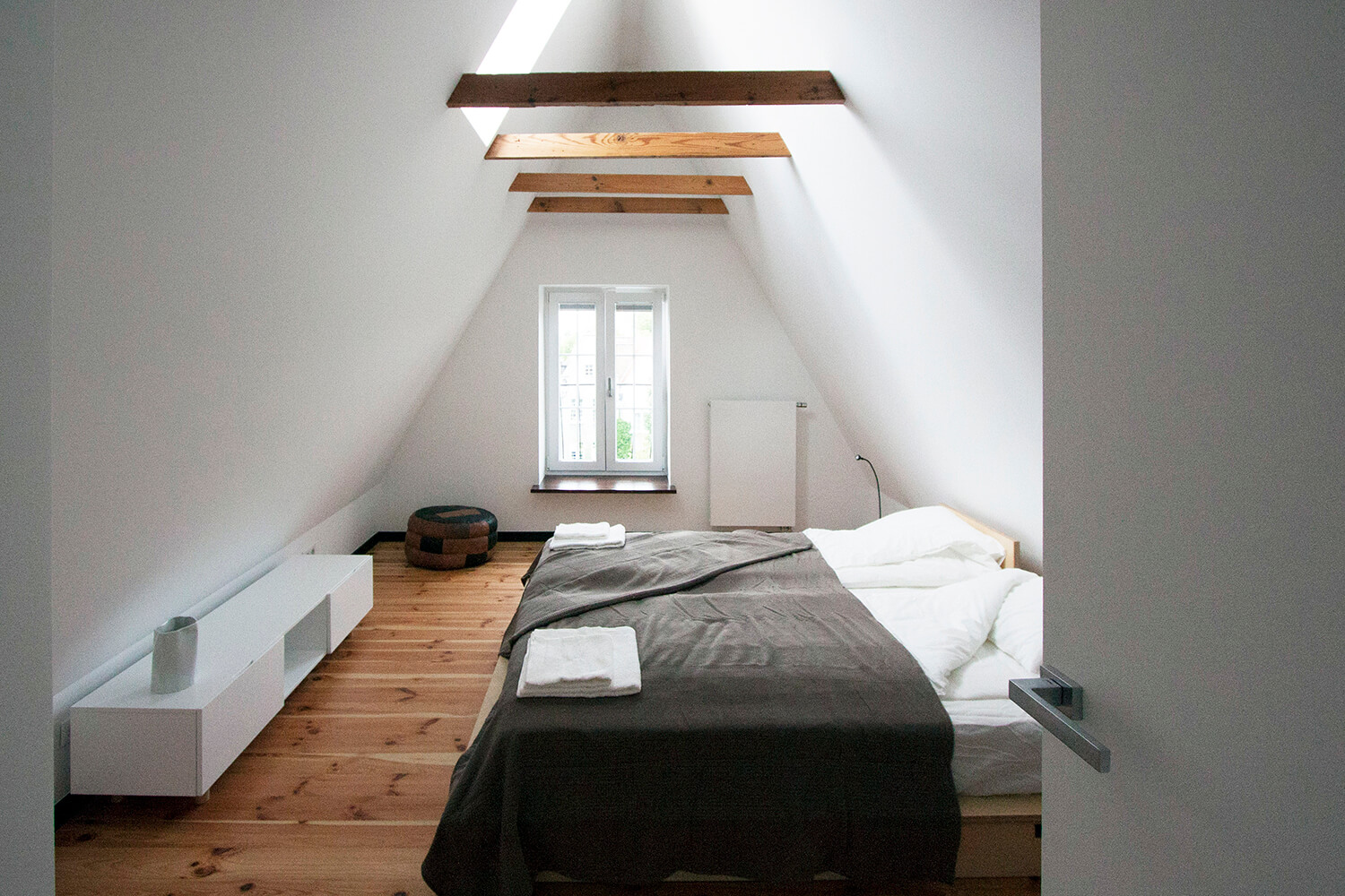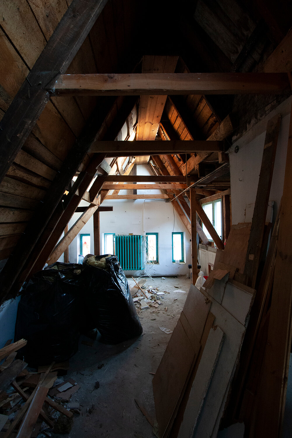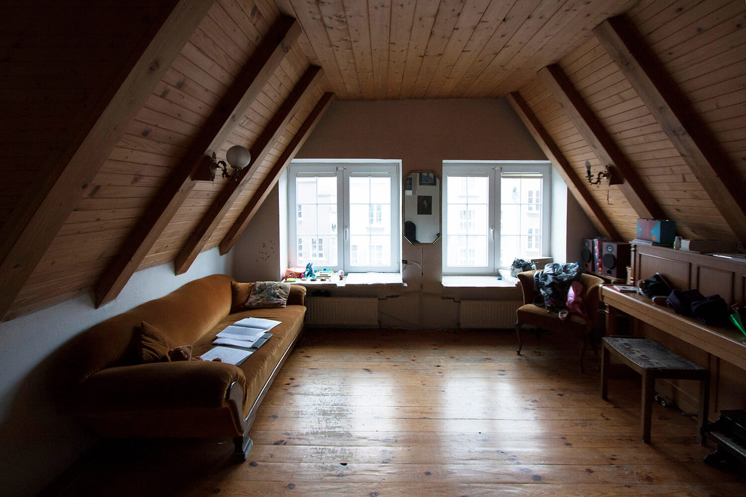 Jednym z głównych założeń projektowych było wyeksponowanie istniejących elementów konstrukcji drewnianej. Belki zostały oczyszczone i zaolejowane, a oryginalne sosnowe deski podłogowe zdemontowano, poddano renowacji w lokalnym warsztacie i ponownie wykorzystano na najwyższym poziomie apartamentu obejmującym kuchnię, jadalnię oraz sypialnię. Częściowo ze względu na obecność tych rustykalnych elementów drewnianych zdecydowano się zachować eklektyczny, nieco rustykalny charakter wnętrza. Minimalistyczne, wykonywane na zamówienie meble do zabudowy zestawiono z meblami i obiektami dekoracyjnymi vintage. W mieszkaniu wykorzystano m.in.: będące w posiadaniu właścicieli klasyczne polskie krzesła Śnieżnik 300-201 wyprodukowane w latach 70-tych przez Zjednoczenie Przemysłu Meblarskiego Bystrzyckie Fabryki Mebli; krzesła z serii No Sign of Design projektu holenderskiego designera Richarda Huttena; wazon i półmisek z holenderskiej manufaktury Zaaalberg; obracany stołek kreślarski z pracowni architektonicznej ojca mojego ówczesnego partnera Klaasa, wazon Pogięty zaprojektowany przez Marka Cecułę produkowany pod marką Ćmielów Design Studio. Nowe życie uzyskało również kilka elementów starego wyposażenia – cudaczny żyrandol kuchenny, żeliwny grzejnik, który przeszedł specjalistyczną renowację i deski z rozbiórki starych schodów, z których wykonano stoliki nocne.