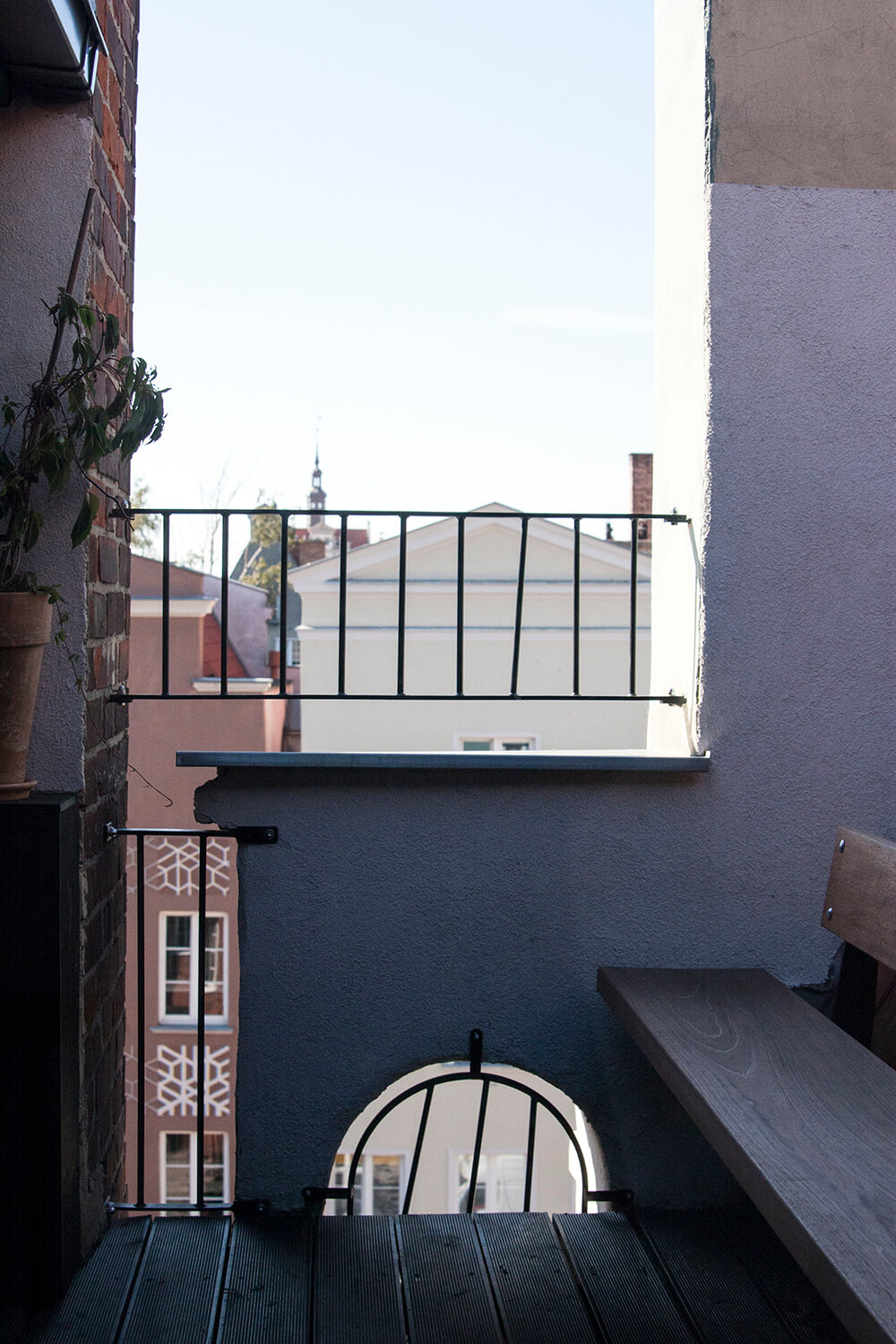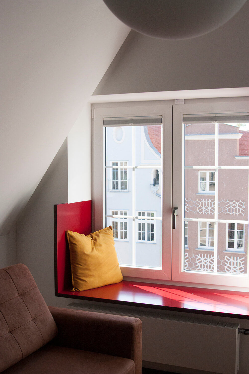 Apartament zlokalizowany jest w sercu gdańskiej 'starówki’, w kamienicach odbudowanych po II wojnie światowej. Powstał w latach 80-tych z adaptacji przestrzeni poddaszy dwóch sąsiednich budynków oraz jednego z pomieszczeń należących do mieszkania na niższej kondygnacji. Rozciąga się na trzech poziomach, oferując nietypowy układ funkcjonalny, wyjątkowe widoki na historyczną zabudowę miasta i tereny stoczniowe, a także niewielki taras dachowy ukryty za elewacjami.