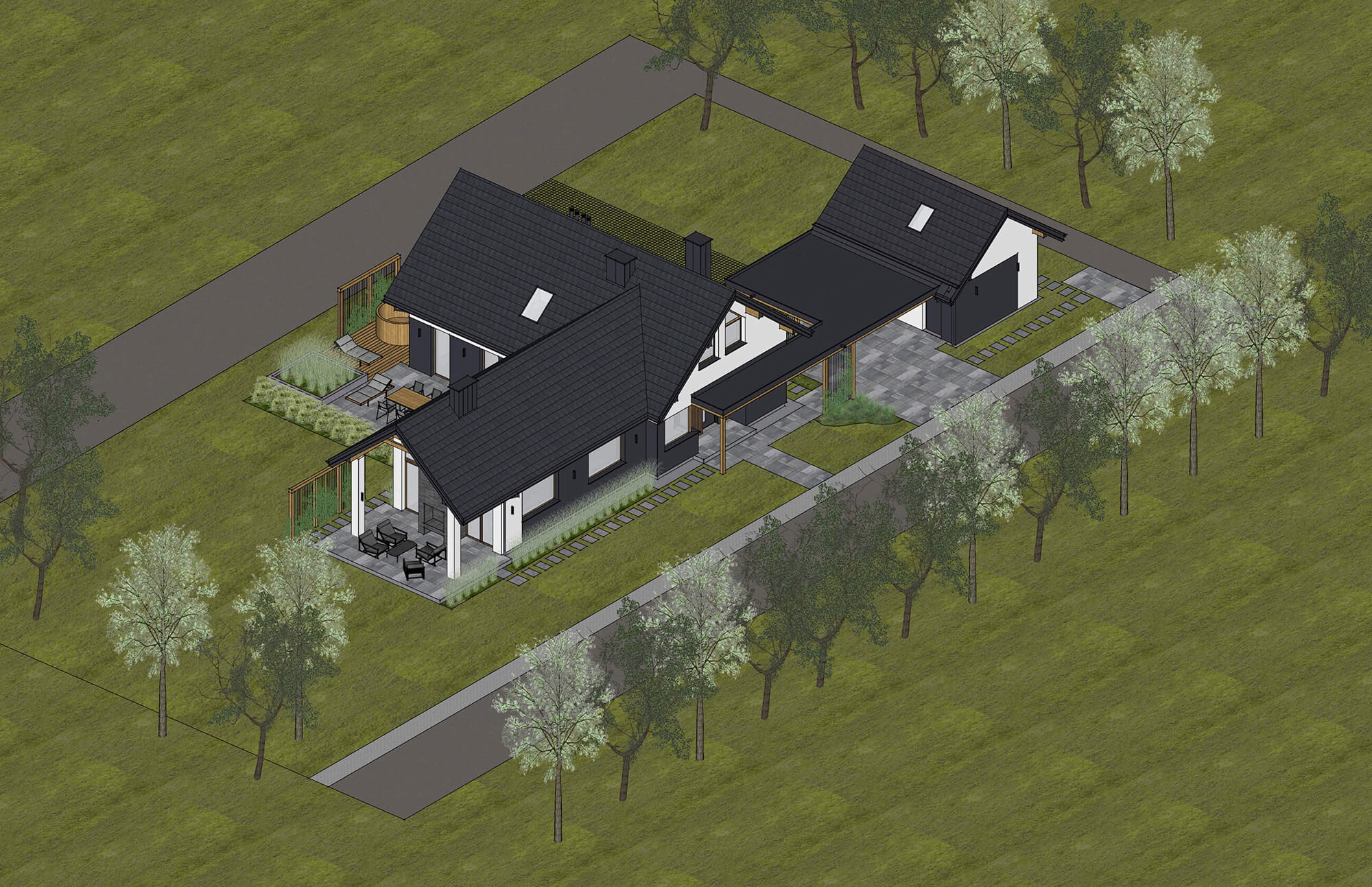 Projekt wzbogaciliśmy o pergole dla pnących roślin, donice oraz wskazanie przestrzeni dla grup zieleni średniowysokiej i niskiej, aby założenia tarasowe utworzyły spójną całość z ogrodem i go nie zdominowały.
