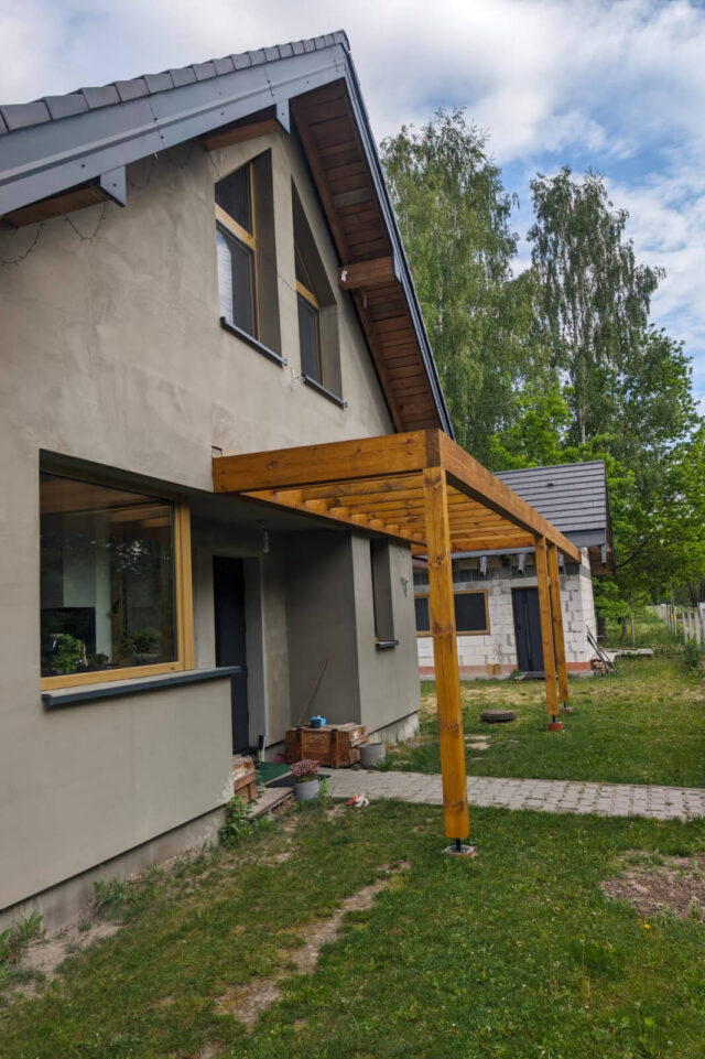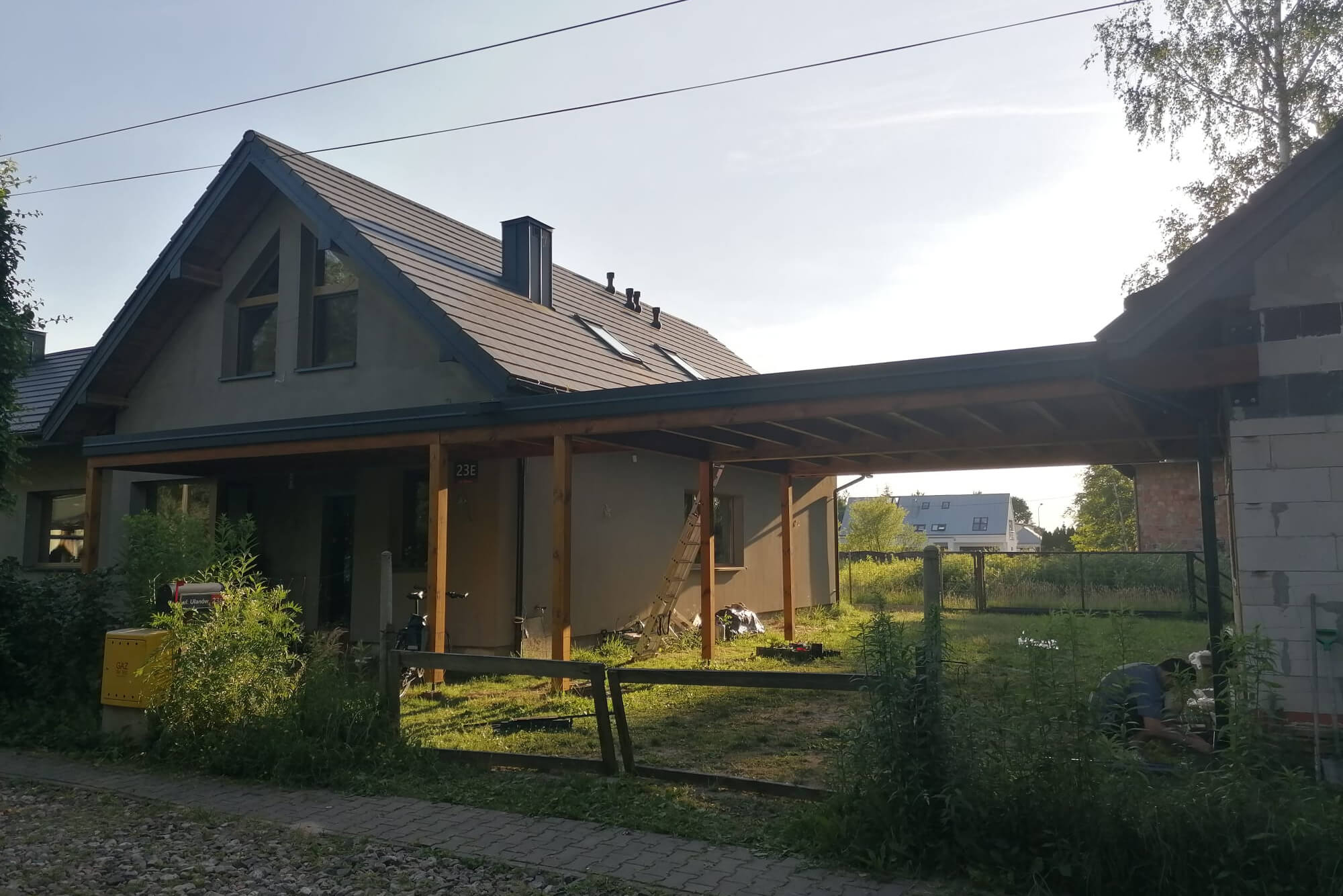 Jednym z największych wyzwań było zaprojektowanie wiaty, która połączy istniejące budynki i nie będzie przytłaczająca. Myślę, że udało się to osiągnąć. Konstrukcja ogranicza się do kilku słupów i cienkiej linii dachu. Płaski dach sprawiał na początku trochę trudności wykonawczych, ale po odpowiednim wykończeniu i wypoziomowaniu, spełnia swoje zadanie.